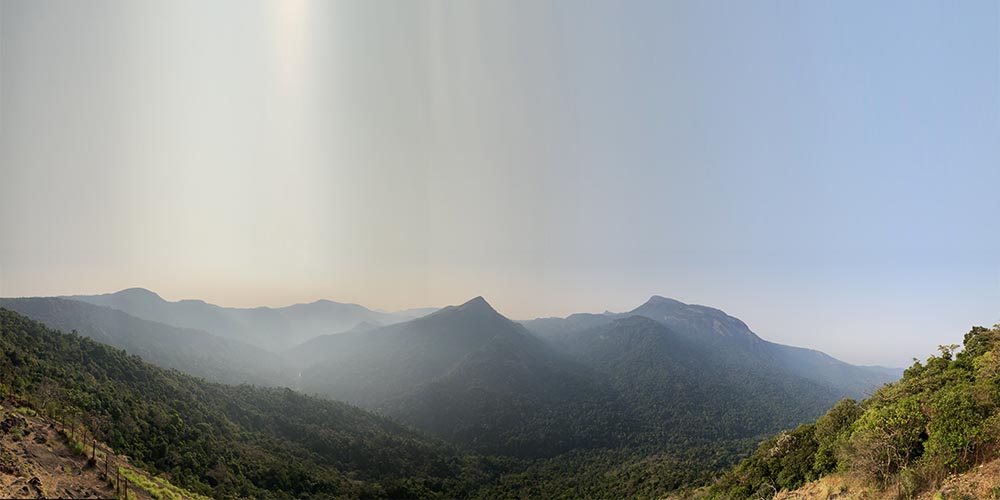 A panoramic view of the Bisle ranges that form the tri junction of districts, extreme left is Pushpagiri and Doddabetta of Kodagu District, in the middle the Kumaraparvatha of Dakshina Kannada and where we stand and to the slight right the Yennikallu and Patla Betta of Hassan District.