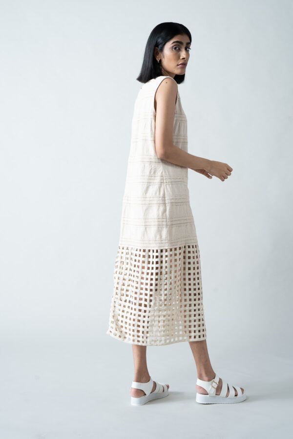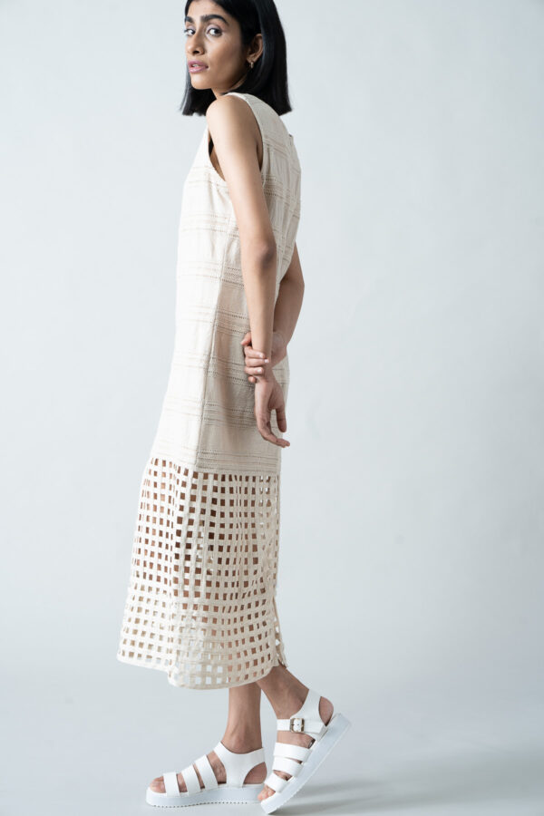 This maxi dress is a celebration of artisanal craftsmanship, made from kora raw cotton with a distinctive bottom weave crafted using cotton tapes. Exclusively handcrafted for you, each piece boasts subtle variations in color, texture, and pattern, making it one-of-a-kind. Designed with a straight, clean-cut silhouette, it’s perfect for any occasion that demands understated elegance.