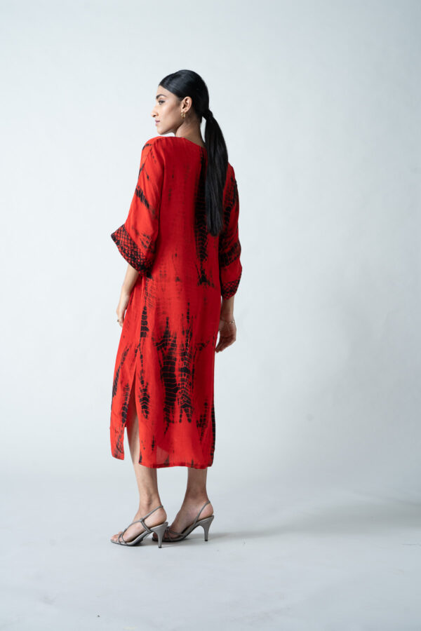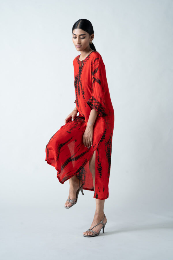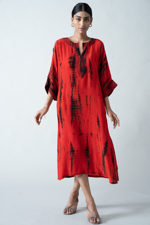 A striking red and black tie-dye kaftan dress crafted from natural crepe, perfect for effortless casual elegance.