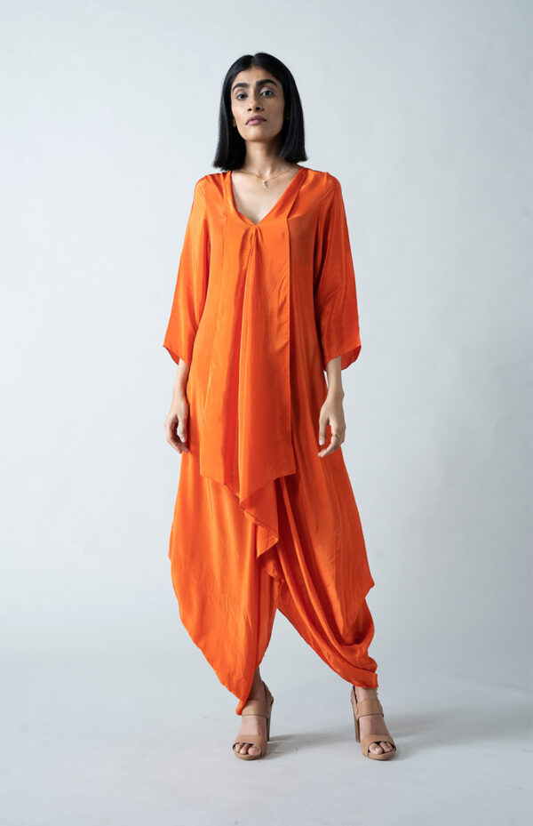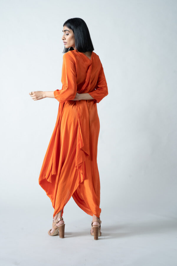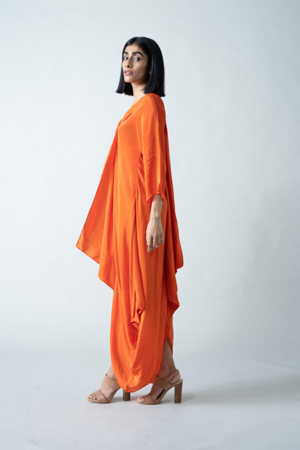 Make a statement with this bold orange dress crafted from natural crepe. Designed with a bias cut, it offers an elegant flow and can seamlessly transition from day to evening with the right accessories.