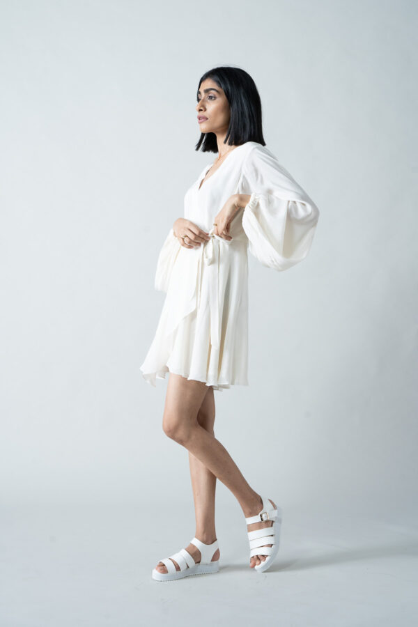 Exude timeless elegance with our white wrap-around dress, featuring vintage-inspired voluminous sleeves and a flattering silhouette.