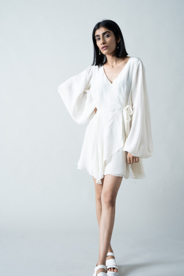 Exude timeless elegance with our white wrap-around dress, crafted from natural crepe fabric for a luxurious feel and sophisticated drape. Designed with vintage-inspired voluminous sleeves that are cinched at the cuffs, this dress combines classic charm with modern sophistication for a truly standout piece.